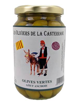 Olives vertes goût anchois variété Picholines bocal verre 200 grammes net